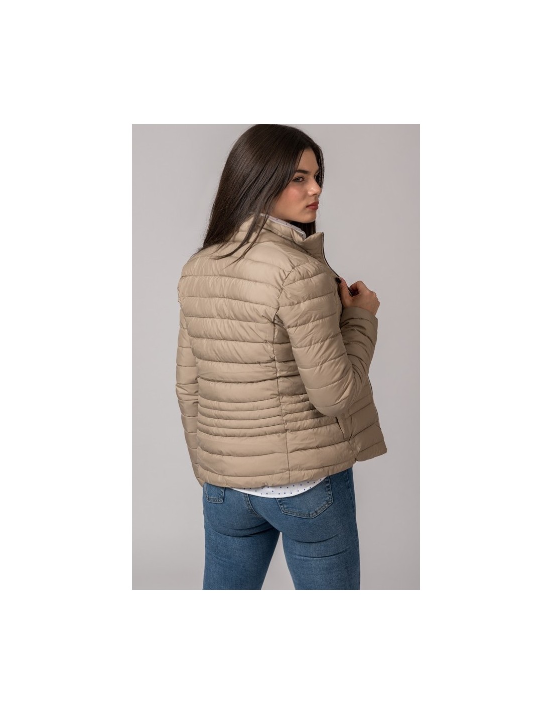 Cazadora de mujer acolchada tipo bandas. Tejido exterior Polyester. Forro Interior polyester. 2 bolsillos inferiores cierre con broche. Cierre central con cremallera. Una prenda de abrigo especial para combatir el frio, cómoda y ligera.