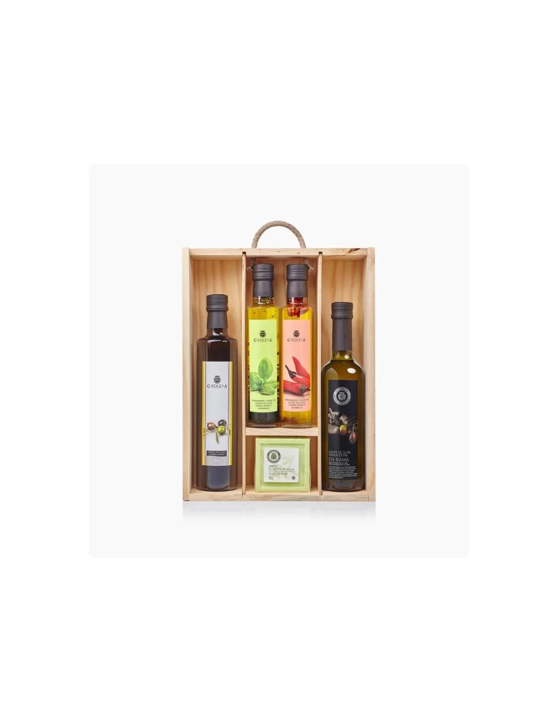 Se presenta en un elegante estuche de madera ideal para hacer un regalo gourmet, con esta selección de productos de gran calidad con las que disfrutar del AOVE en toda su esencia.