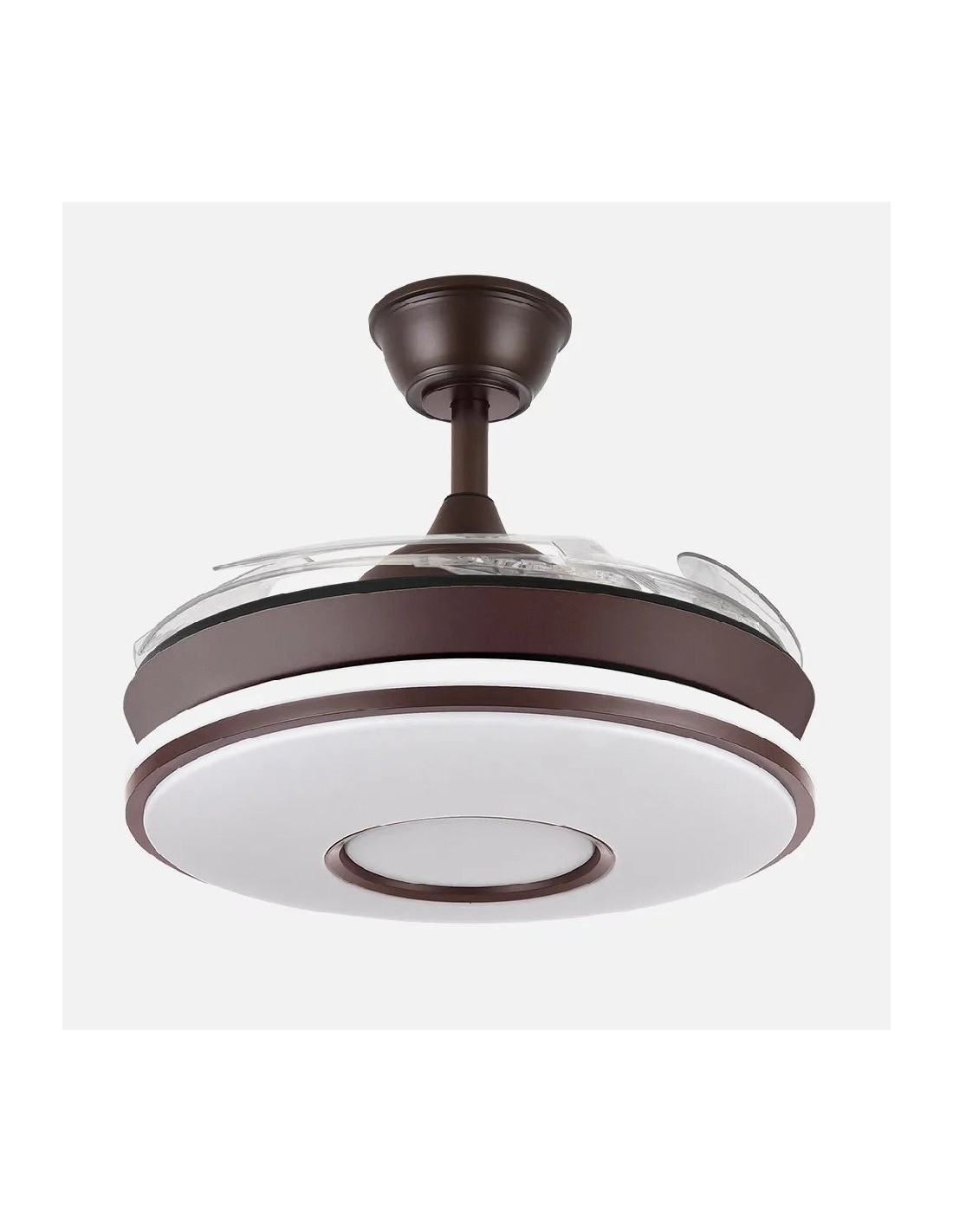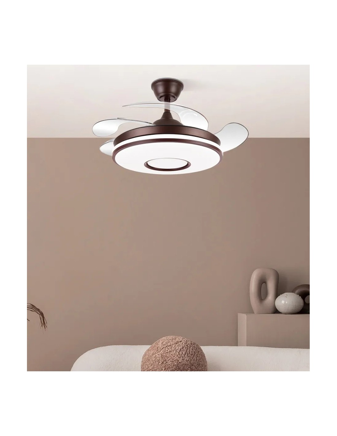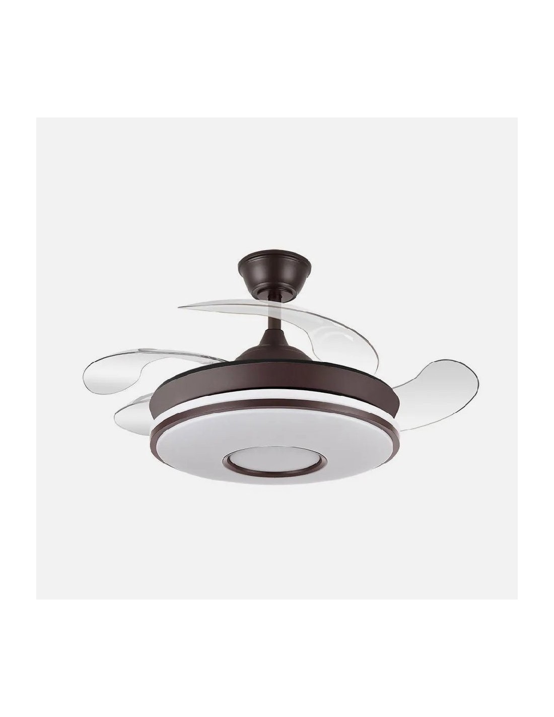 Descubre el ventilador DC DANI, una joya de diseño realizada en metal y policarbonato, con un sofisticado acabado en color marrón. Su innovación radica en sus cuatro aspas desplegables de ABS transparente, resistentes y funcionales, que se esconden cuando no están en uso, fusionando estética y tecnología.